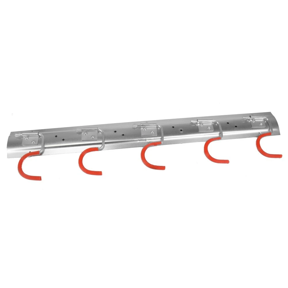 Breite Leiste mit 5 klappbaren Haken zum einfachen Aufbewahren von Besen, Rechen, etc. Die Breite von ca. 50cm bietet jedem Gerät genug Platz, so dass diese sich einfach aufhängen lassen und sich nicht gegenseitig behindern.