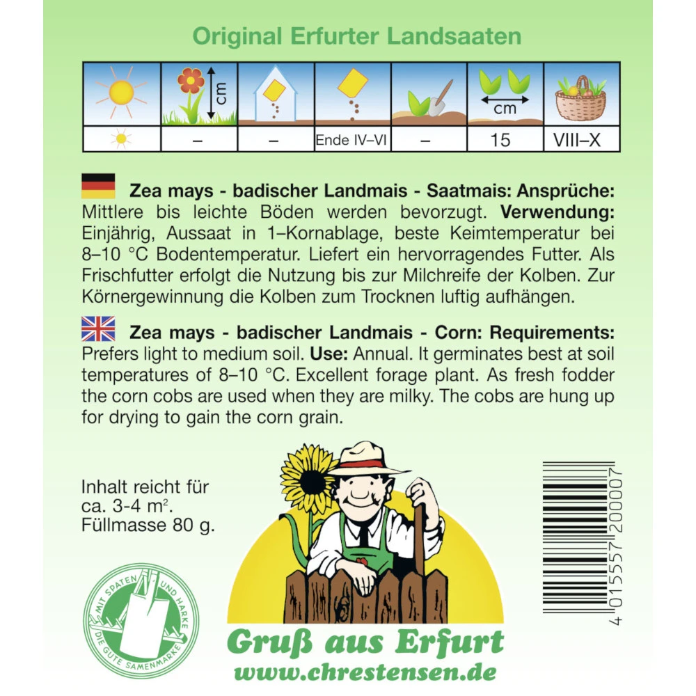 - 1 x Saatgut Saatmais badischer Landmais (ausreichend für ca. 3 – 4 m²)